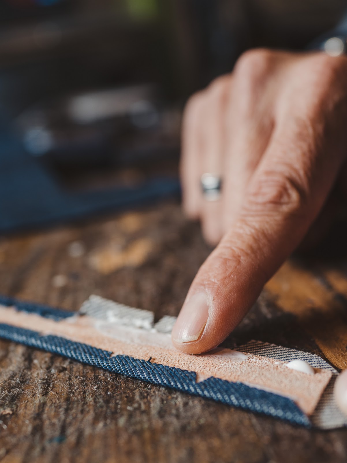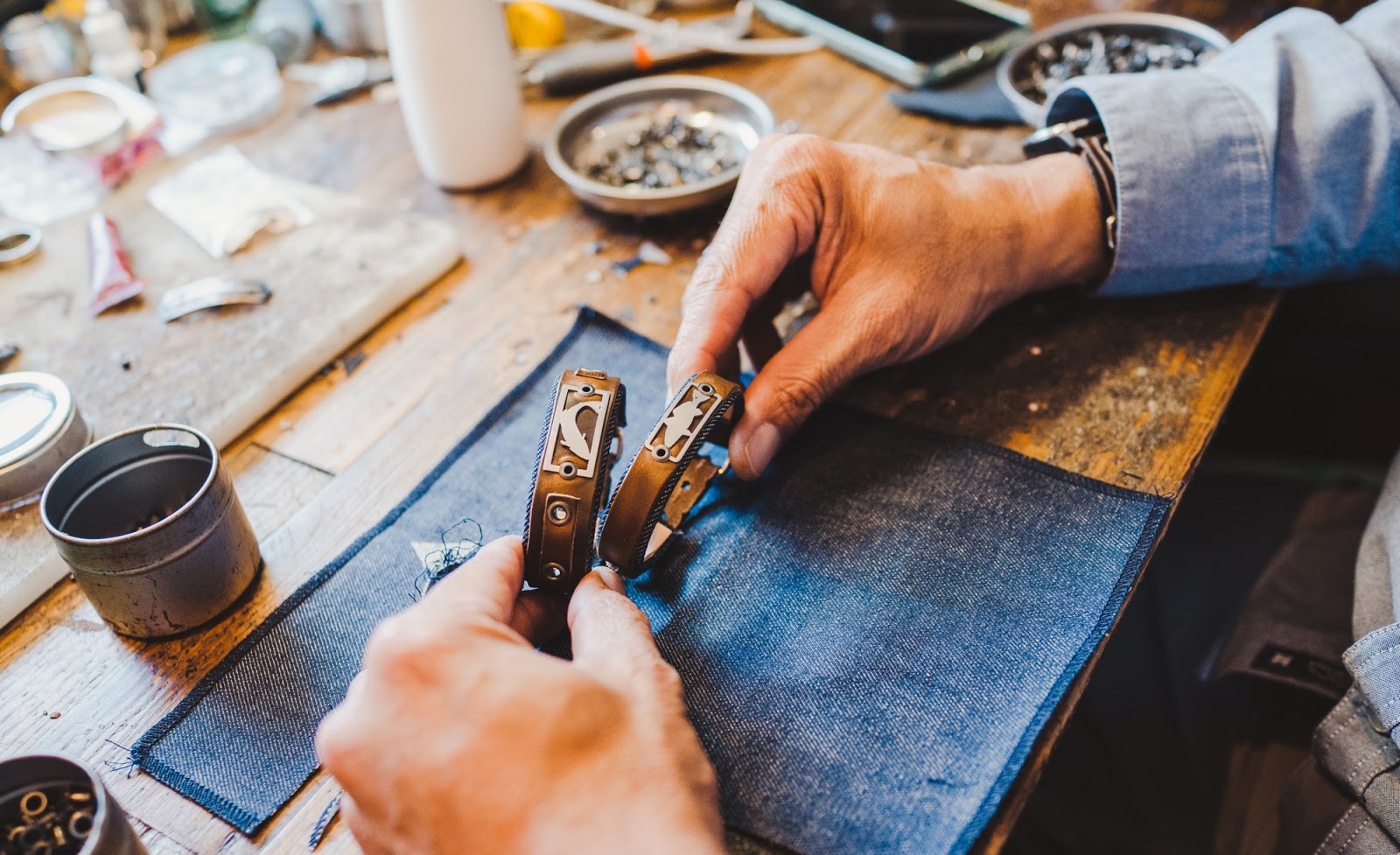 We met as many do these days in this virtual world. Our first interaction was an exchange of messages after he posted on a picture of mine that went viral on social media. We messaged back and forth for months trying to align our schedules to connect in person, but never found the opportunity to link up. I planned to travel to Austin to visit my wife during her work trip over SXSW weekend. My wife has worked for the company that owns Wrangler jeans for over thirteen years and we both love denim. Greensboro, NC was home to Cone White Oak Mills that recently closed its doors and production. This mill provided denim worldwide and to Wrangler. I negotiated with my wife to land me a swatch of the Cone denim fabric so I could use it for a special project. I knew I had to have Edgar create a custom set of bracelets using this material. After telling him of my plan, he was equally excited to collaborate on a unique set of bracelets. The day was planned and we marked it in our books.