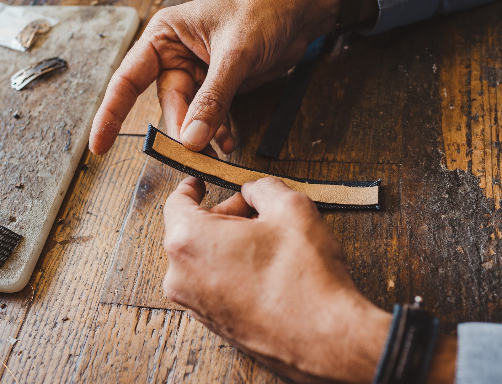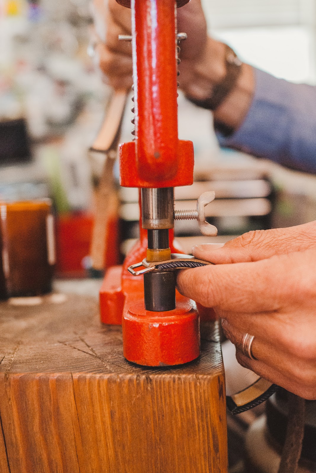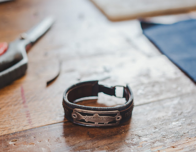 Once I arrived I knew I was in great hands. I was immediately greeted by Timber the shop dog. The scent of leather and the sound of sand blasted metal filled the air. The studio exudes the fly fishing industry with random rods, reels, industry stickers, posters and laser cutouts of fish. His assistant was jamming away with her headphones on while finishing a new batch of bracelets for an upcoming event. After brief introductions and a quick tour of the shop we began brainstorming a few ideas for the custom bracelets. During this time it was clear Edgar had a passion for his company and his craft. Not a single detail goes unnoticed and the entire process has been meticulously refined over time. Every rivet is hand pressed, each hole hand punched, and the material is cut and glued with care. All of these components on their own could be mistaken as scraps but he turns these raw goods into a functional piece of art. After a couple hours the bracelets are finished and ready for wear.