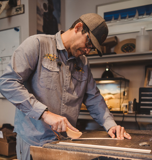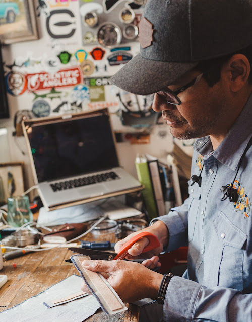 Dave wrote... "The Lone Star state is well known for large companies like Dell and Whole Foods but companies like Yeti and smaller influencer clothing brands like Howler Brothers also call this state home. What some may not know is that there are many small craftsmen that are influencing the fly fishing industry in this same state. My journey to Austin brought me to Edgar, owner and creator of Sight Line Provisions. His company is based outside of Austin, Texas and is known by anglers for their handmade bracelets. The business operation is located in a small studio connected to his house. There, Edgar and his assistant produce incredible hand crafted goods. They focus on using materials ranging from leather, denim, and canvas topped with custom laser finished metals.