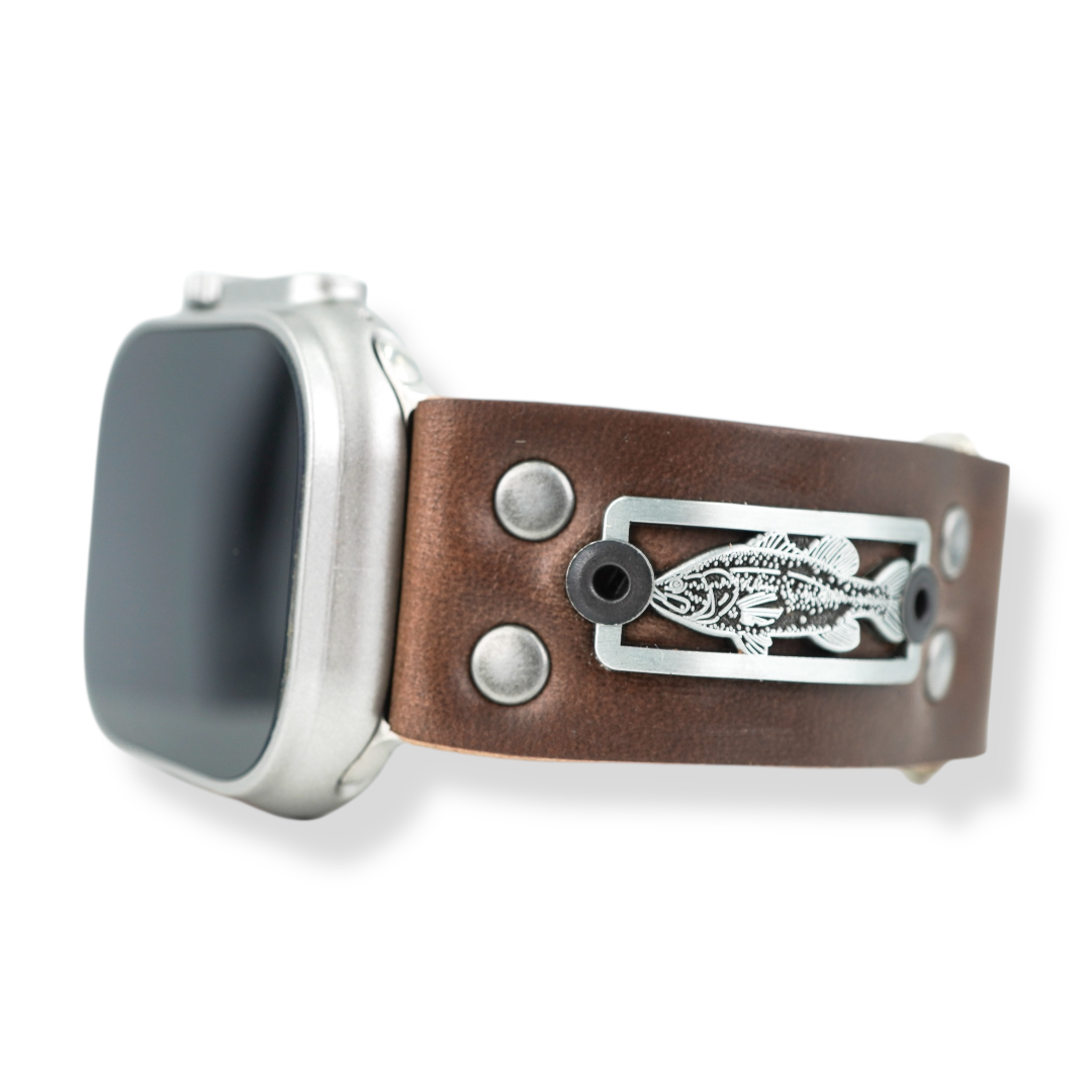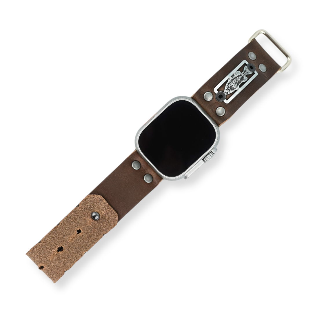Textured Bass diecast skinny badge mounted on 1” leather watch band. Attach to your Apple Watch with a new and improved one piece metal strap connector. Fastened with ‘just right’ adjustable sizing closure to size down to 6" up to 8" wrist.