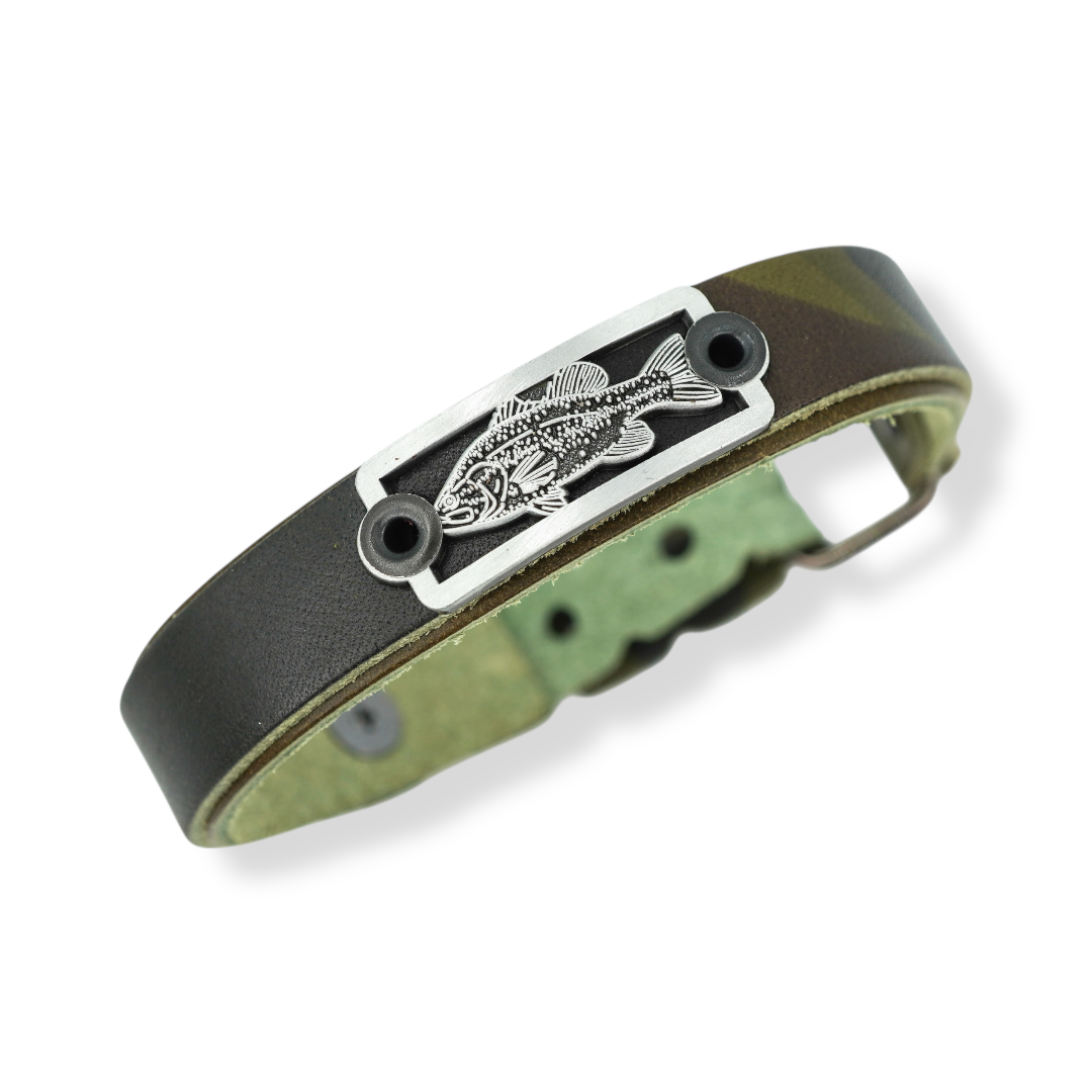 Bass cast badge mounted on .60” leather camo cuff. Fastened with ‘just right’ adjustable sizing closure to size down to 6" or up to 8" wrist.