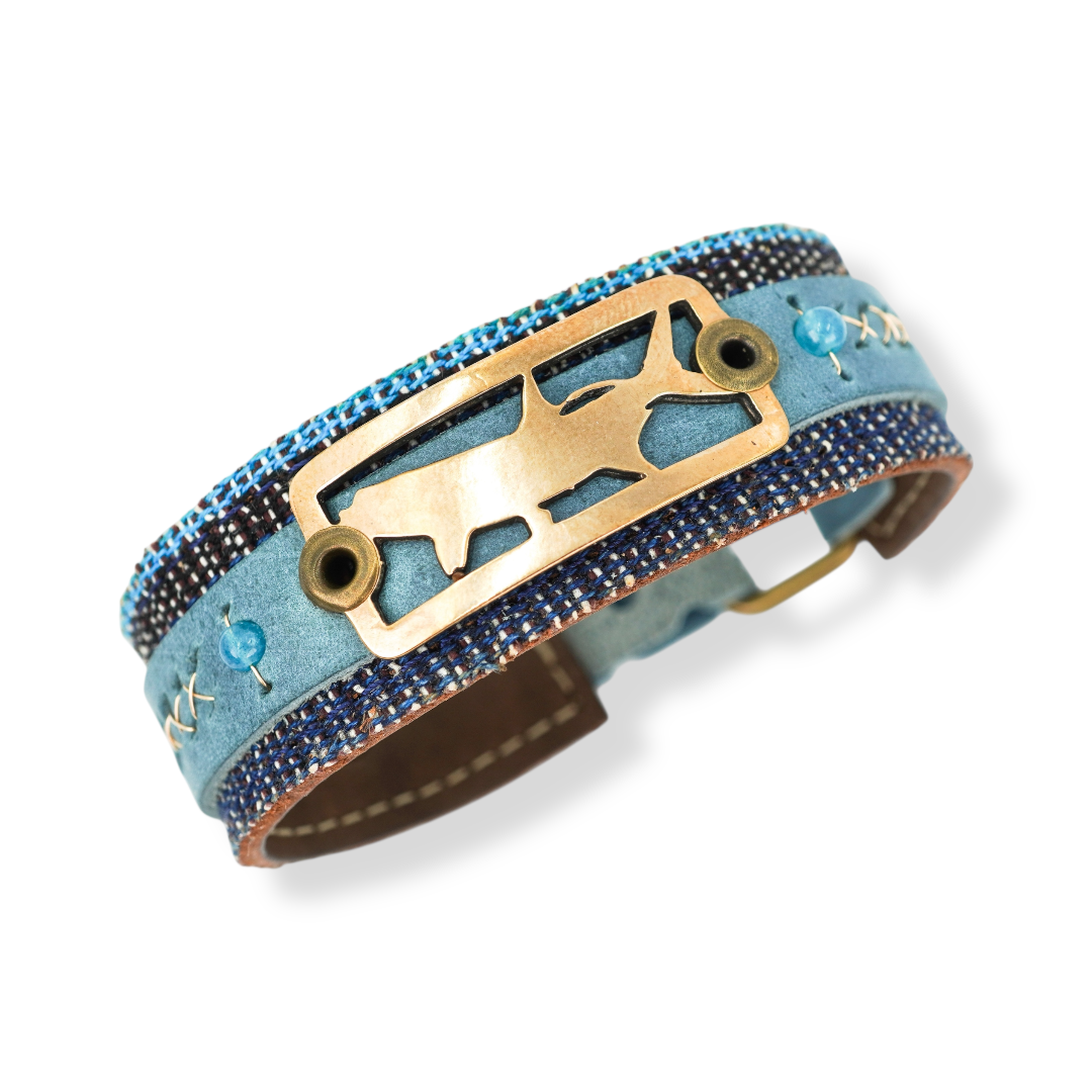 This bracelet features a Tarpon bronze badge mounted on our Atlas Blue leather strap with apatite beads accented with gold-filled wire stitching and Guatemalan textile stitched leather base. Adjustable sizing for the perfect fit.
