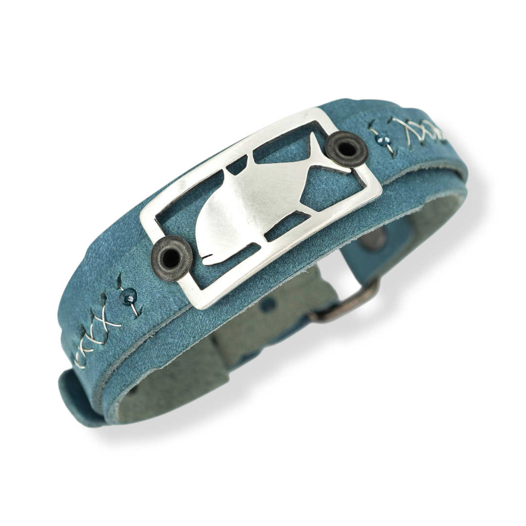 Silver Giant Trevally badge on atlas blue leather bracelet with hand-stitched silver wire and accented with .10 carats of faceted blue diamond beads. Adjustable sizing for the perfect fit.