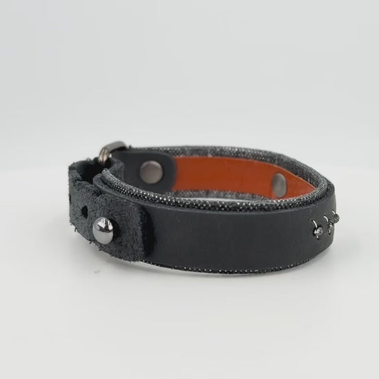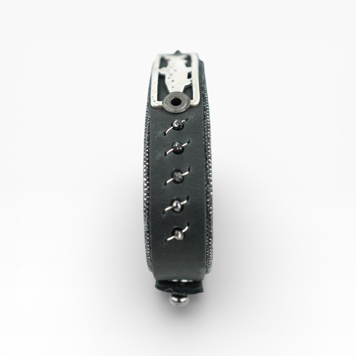 Sterling silver Trout badge mounted on 0.6" waxed linen wrapped leather bracelet. Accented with charcoal Horween leather and 3 carats of black diamonds stitched on each side of the badge. Fastened with ‘just right’ adjustable sizing closure to size down to 6" or up to 8" wrist.