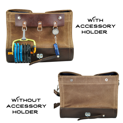 Waxed canvas bag with premium leather accents and riveted white bronze Trout badge. Exterior 11.5" wide X 5" deep X 10" tall and interior dimensions 11" side X 4.5" deep X 9" tall. Strap is 58" long with buckle closure that adjusts 50".