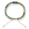 Fishing bracelet with metal Permit bead on 6mm semi-precious aquamarine beads and 6mm hematite discs. Moveable pulley closure opens to 10.5" and closes to 6.5" wrist size.