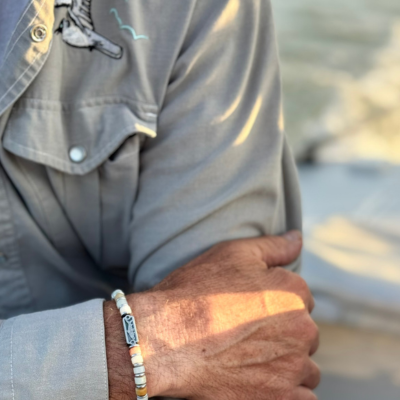 Hand-strung with cylindrical stone beads in shimmering silvers, soft grays, and ocean blues, the design mirrors the way a bonefish glints beneath the sun as it streaks across shallow water.