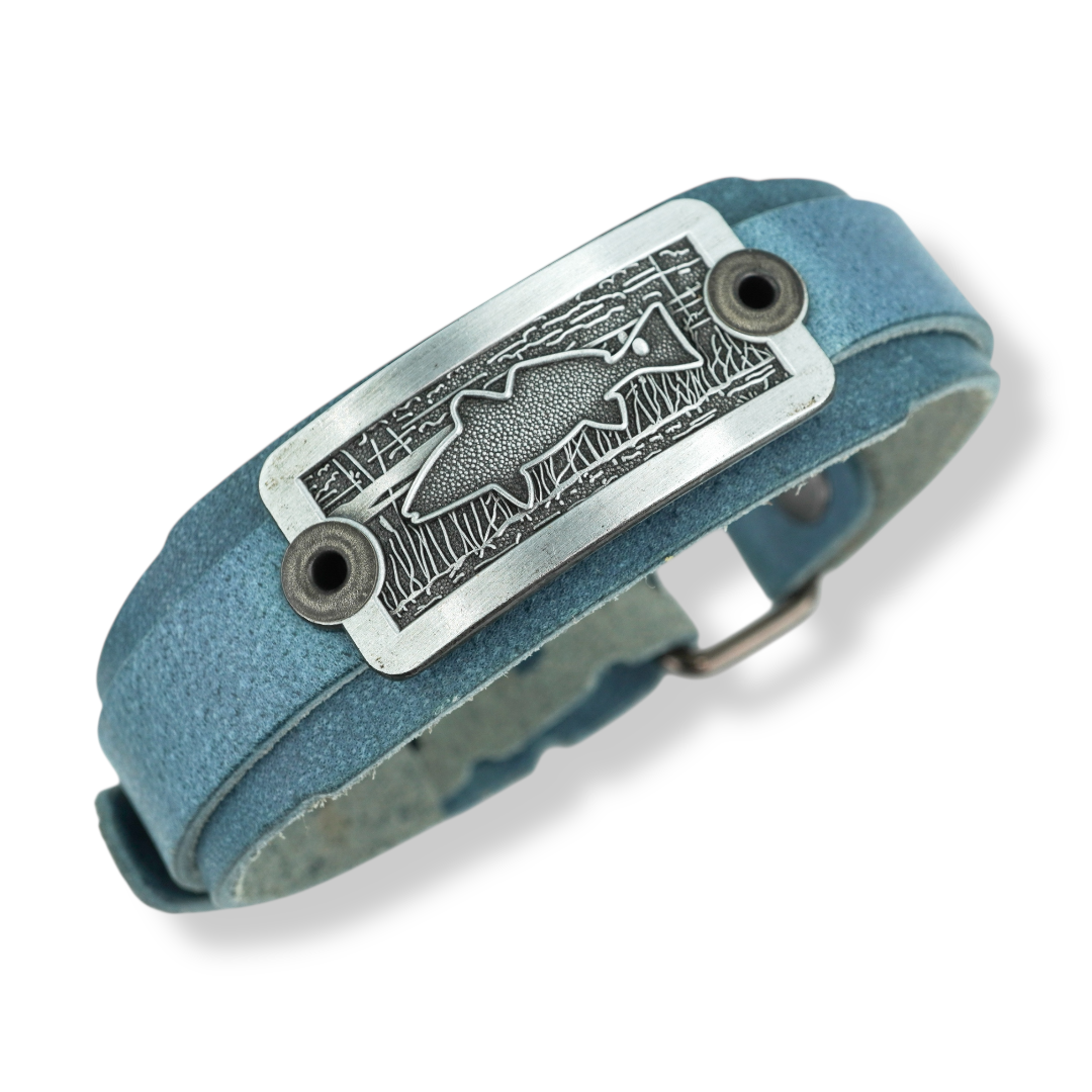 Fishing bracelet with a diecast badge mounted on 1” tapered leather bracelet. Fastened with ‘just right’ adjustable sizing closure to size down to 6" or up to 8" wrist.