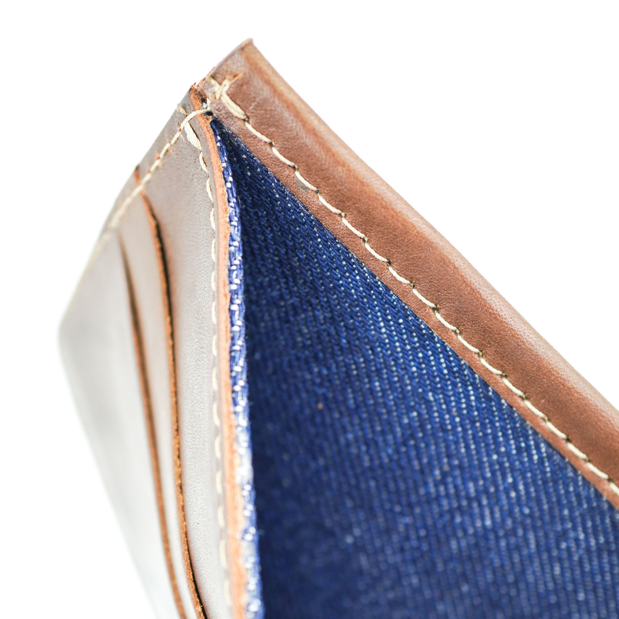 Bronze skinny on point badge riveted on leather wallet with durable nylon thread stitching and our Fall denim textile interior. Measures 4.5" length x 3.5".