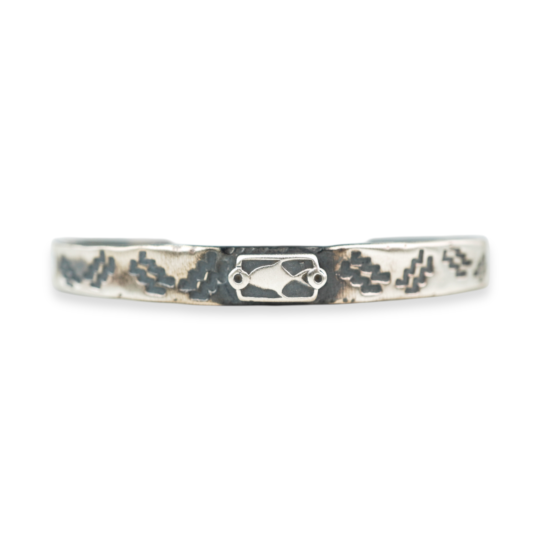 Width of center 8mm x 1.5mm thick. Measuring 8mm wide at the front down to 5.5mm along the tapered back. This specific piece fit up to a 8” wrist. These all sterling silver cuffs can be sized for wrists 5" to 6.5" if the order is placed for that size.