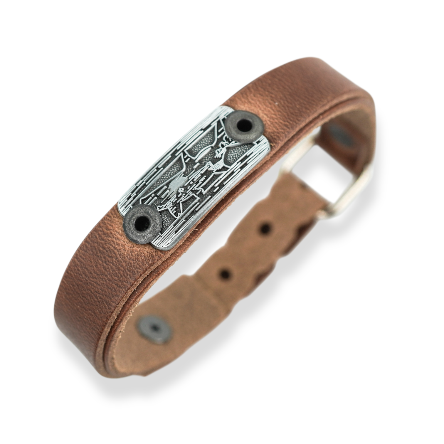 Fishing bracelet with a diecast badge mounted on .50” leather fishing bracelet cuff. Fastened with ‘just right’ adjustable sizing closure to size down to 6" or up to 8" wrist.