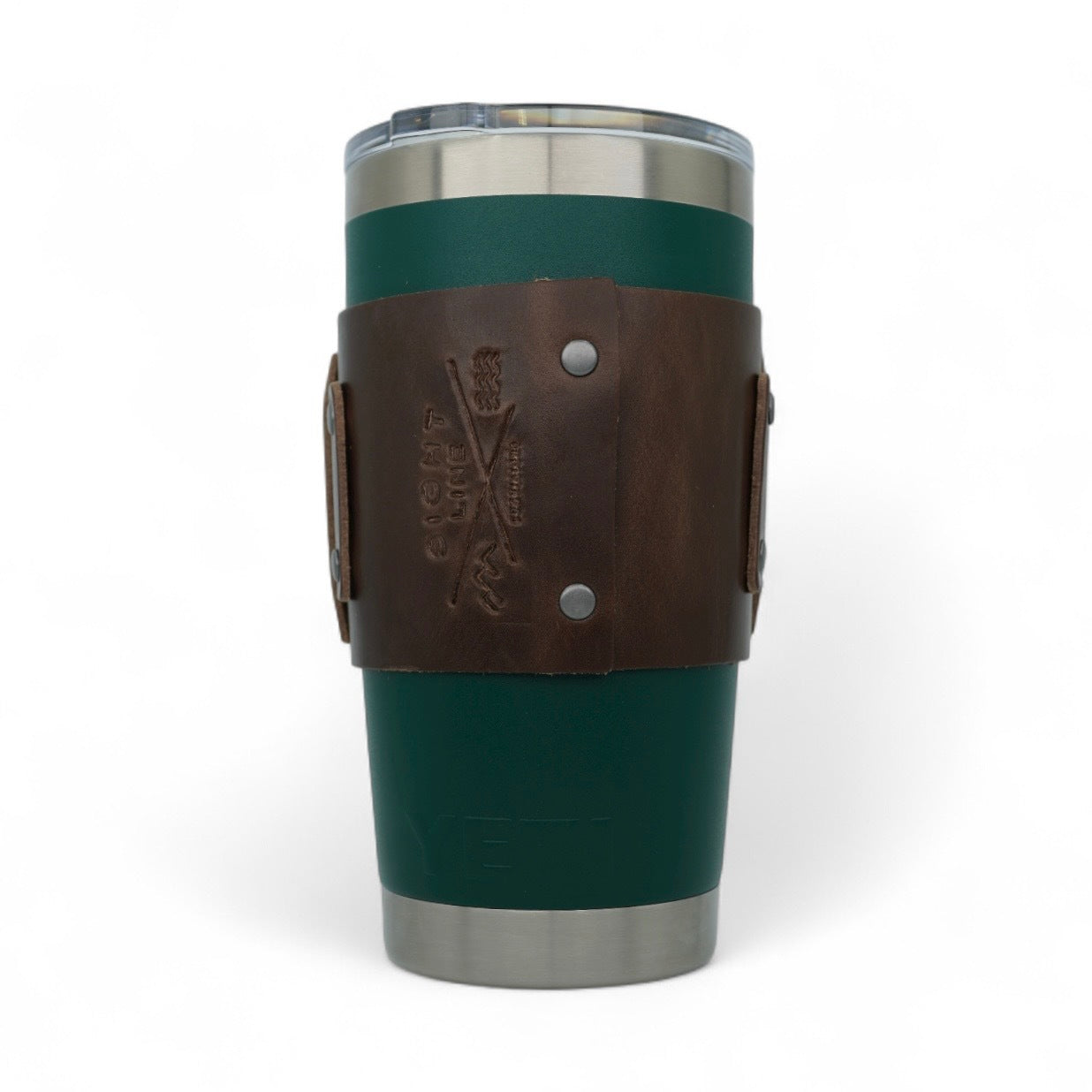 Stainless steel dry fly badge riveted to 3" tall premium leather cuff designed for 20oz Yeti Tumbler. Leather cuff slides up the bottom of the Yeti for snug fit, and easy removal for washing your Yeti.